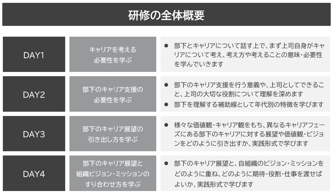 DAY1では、まず管理職に就いている受講者自身のキャリアについて深く考える場を提供。DAY2では、メンバーのキャリア支援を行ううえで、その意義や上司としての役割について学んでもらいました。その後DAY3、DAY4では、実践的なワークを中心に構成し、メンバーへのキャリア支援に向けての対話の仕方や言語化の技術、さらにエーザイならではのビジョン・ミッションと個人のキャリアを重ね合わせるプロセスなど、オリジナルのプログラムを実施しました。